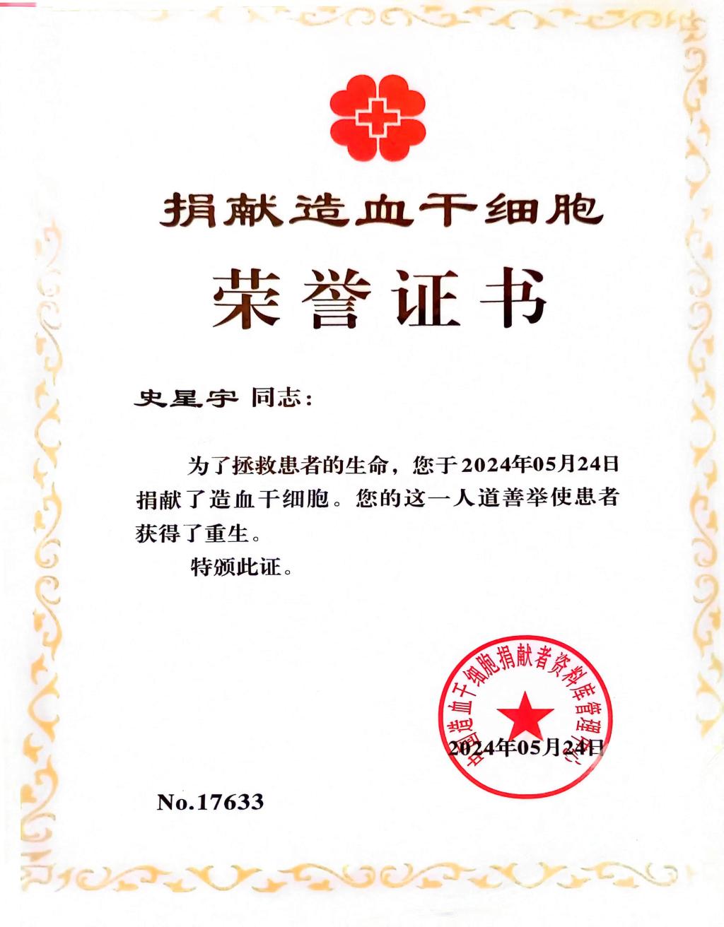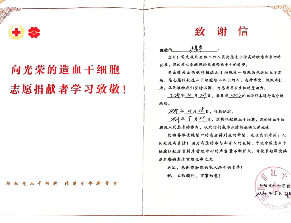 2022年11月4日,史星宇同学在学校无偿献血活动中,主动了解并加入中华骨髓库。2024年4月22日,经过中华骨髓库检索,史星宇同学的HLA分型资料与一位白血病患者初配相合。在接到工作人员通知后,毫不犹豫地表达了履行捐献意愿的决心。5月24日,经过二次高分检测和严格体检,史星宇同学在岳阳市中心医院成功完成了造血干细胞的采集。据史星宇的班主任介绍,他是一个充满理想和爱心的学生,从小便有着坚定的志向,希望成为一名军人,为国家和人民奉献自己的力量。最近,他为了捐献造血干细胞,甚至放弃了地方征兵入伍的机会。他深思熟虑后认为:“参军还有机会,但每个人的生命只有一次。”