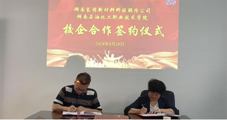本网讯 为进一步深化职业教育教学改革,全面推进产教深度融合,更好地为区域现代石化产业发展服务,4月28日上午,我校与湖南长炼新材料科技股份公司签署校企合作框架协议,双方就校企合作方式及教师企业实践、学生实习实训等具体事宜进行了深入交流。随后举行了“石油化工技术专业群教师企业实践流动站”挂牌仪式。