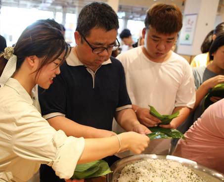 食堂里,碧绿的粽叶、洁白的糯米、腌好的肉馅……包粽子所需的食材和工具已经整齐地摆放在桌上。有经验的老师和同学把粽叶做成漏斗状,将糯米和猪肉填入其中,再封口拿线捆好,动作有条不紊。“菜鸟”新手在一旁,边看边学,跃跃欲试,手中的粽子也渐渐有模有样起来。