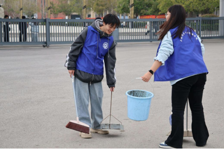 考试当天,身着蓝色马甲的志愿者以饱满的热情开启助考服务。他们在校园内打扫卫生,捡拾垃圾,保证考试环境整洁。面对考生及家长的各类咨询,他们耐心解答、认真指引路线,在志愿者的引导下,考生有序排队入场。