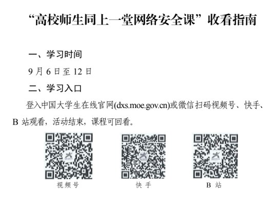 4.上好一堂网课。各单位要组织师生收看网络公开课推出的“高校师生同上一堂网络安全课”(附件1)。