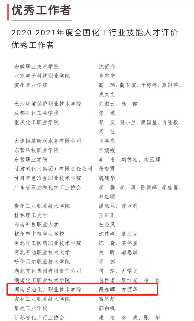 喜报:我校荣获2020-2021年度全国化工行业技能人才评价先进单位,继续教育学院方丽华、段春晖获全国化工行业技能人才评价优秀工作者。