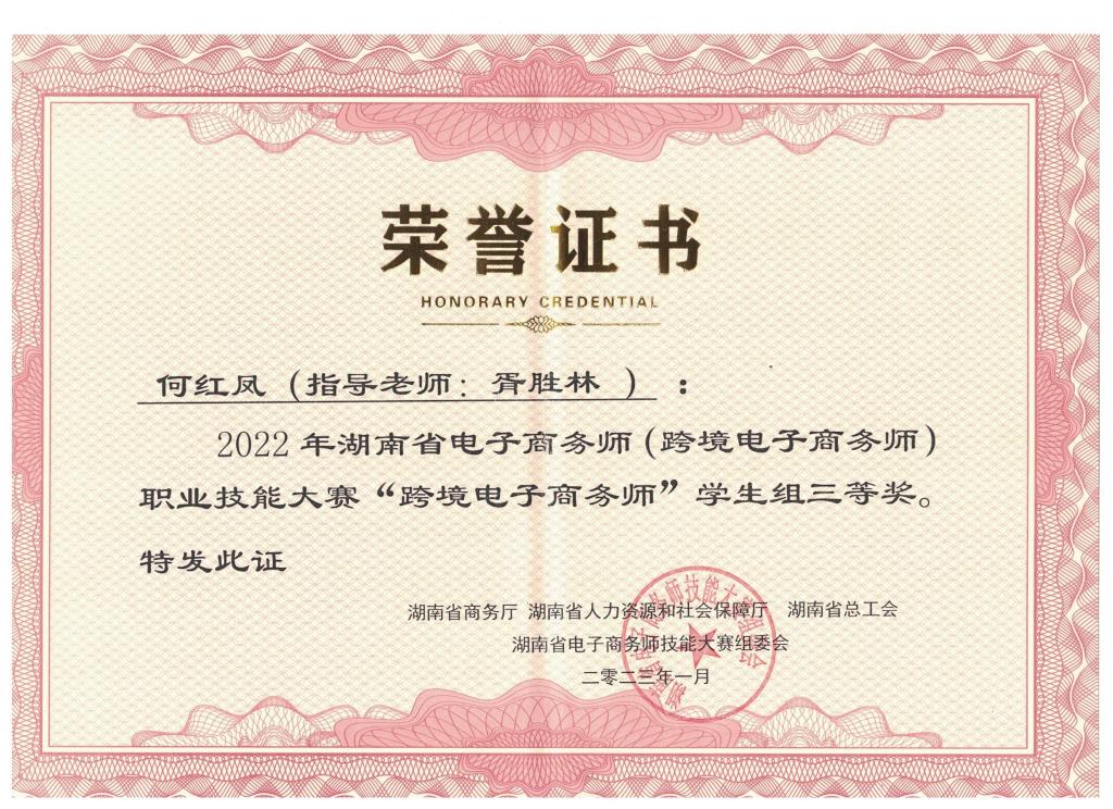 喜报:在11月12号,湖南省人社厅和湖南省商务厅主办的2022年跨境电子商务师职业技能大赛中,我校胥胜林、卢芳、李容容等老师指导的学生喜获一等奖1项,三等奖1项。学校获得优秀组织单位奖。