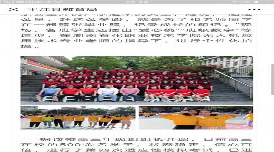 机电工程学院无人机技术专业学生为岳阳平江中学提供无人机航拍毕业照,受到平江县教育局的充分肯定。“爱心桃”献给老师,“班级数字”留在每位即将高中毕业的同学心中。