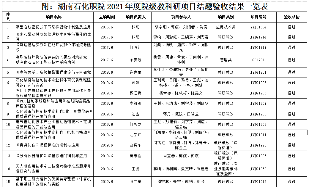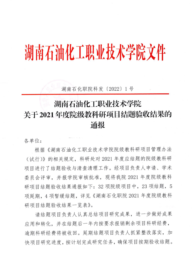 湖南石化职院科发〔2022〕1号-关于2021年度院级教科研项目结题验收结果的通报