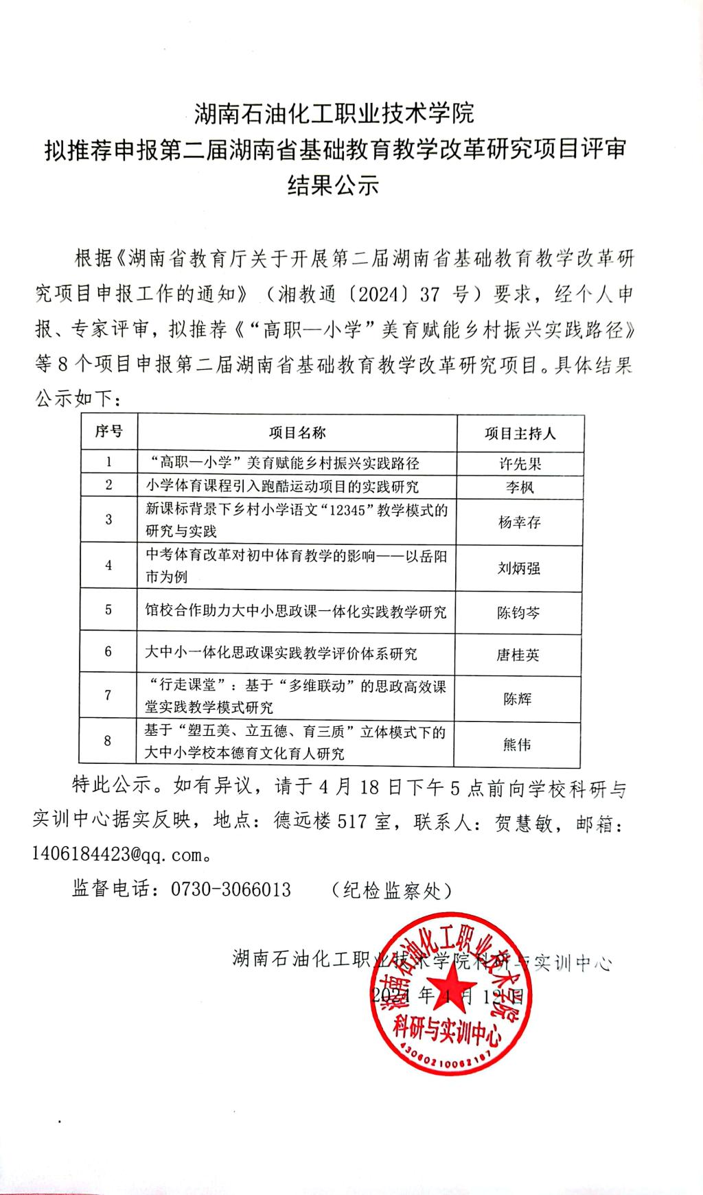 湖南石化职院湖南省教育厅第二届湖南省基础教育教学改革研究项目评审推荐结果公示