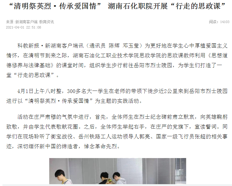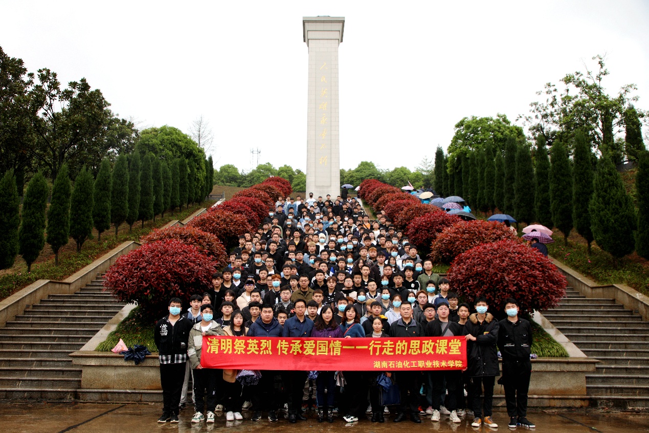 习近平总书记指出,“思想政治理论课是落实立德树人根本任务的关键课程”、要重视思政课的实践性,把思政小课堂同社会大课堂结合起来,在学生心中“厚植爱国主义情怀”。在清明节到来之际,湖南石化职院思政学院思政课教师利用《思想道德修养与法律基础》课堂时间,组织学生步行前往岳阳市烈士陵园,为学生上了一次行走的思政课。
