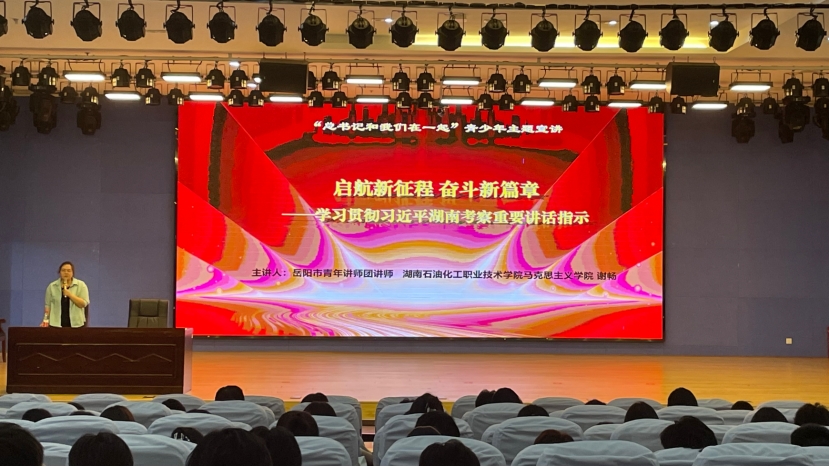 6月17日,为深入学习宣传贯彻习近平总书记考察湖南时的重要讲话和重要指示精神,岳阳市“80 90 00”青年讲师团“总书记和我们在一起”青少年主题宣讲活动在87978797威尼斯老品牌开展。岳阳市青年讲师团讲师、87978797威尼斯老品牌马克思主义学院副院长谢畅面向近400名学生进行了题为《启航新征程 奋斗新篇章—深入学习贯彻习近平总书记考察湖南重要讲话精神》的主题宣讲。此次宣讲旨在引导广大团员和青少年将思想和行动统一到习近平总书记的重要讲话和重要指示精神上来,将力量凝聚到实现习近平总书记对湖南工作的重要指示要求上来。
