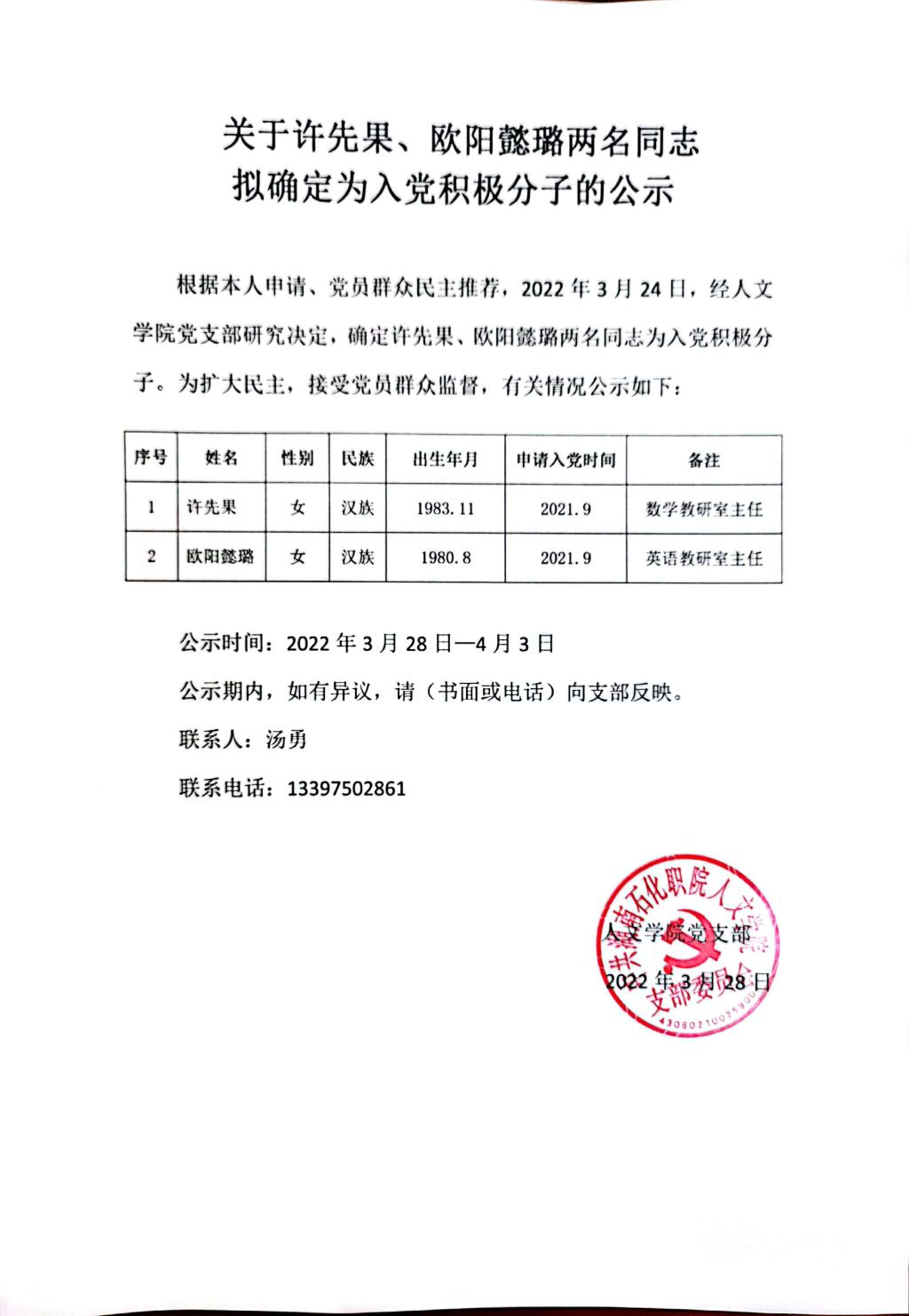关于许先果、欧阳懿璐两名同志拟确定为入党积极分子的公示