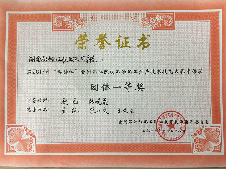 作为我省唯一代表队,我院派出了由三位学生包正文(应化31501班)、王凯(石化3163班)、王义臣(石化3161班)和两位指导教师(赵克、张晓磊)组成的代表队参加了本次比赛,经过三天的激烈比赛,我院代表队最终以总分第二名的成绩荣获2017年“博赫杯”全国职业院校石油化工生产技术技能大赛团体一等奖, 赵克、张晓磊两位老师荣获“优秀指导教师”荣誉称号。