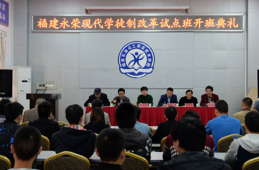 10月30日下午3点,福建永荣现代学徒制改革试点班开班典礼在我院图书馆多功能厅举行。学院副院长符文文、福建永荣公司副总经理熊先飞、学院招生就业处主任高敏知、教务处处长黄建华、石化技术工程系书记刘顺清、教师代表、企业代表以及福建永荣班全体同学出席开班典礼。本次典礼由我院石化技术工程系系主任肖宜春主持。