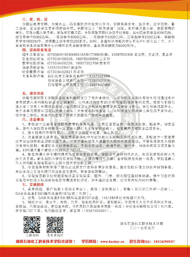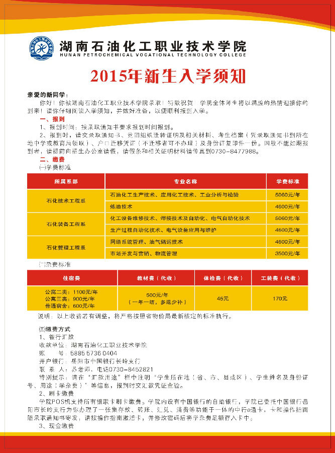 湖南石化职院2015年新生入学须知